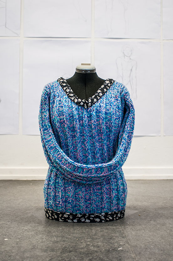 Acrylwolle, gestrickt, Säume aus geblümtem Stoff.